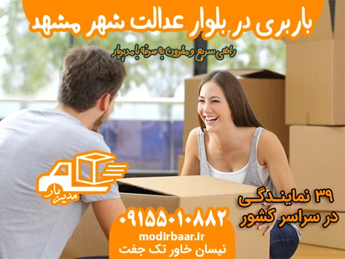 یکی از محورهای اصلی در غرب این کلانشهر مذهبی است که بهدلیل توسعه شهری، تراکم جمعیتی بالا، بافت مسکونی و تجاری فعال، به یکی از مناطق پرتقاضا برای خدمات باربری تبدیل می شود. در سالهای اخیر، با گسترش نیاز به باربری معتبر، نیرو متخصص، راننده باتجربه، باربر و بارچین حرفهای، شرکتهای متعددی در بلوار عدالت فعالیت خود را آغاز کردهاند و خدمات متنوعی را در حوزه اسبابکشی، بستهبندی کار، حمل و نقل، صدور بیجک، بارنامه و کارنا ارائه میدهند.