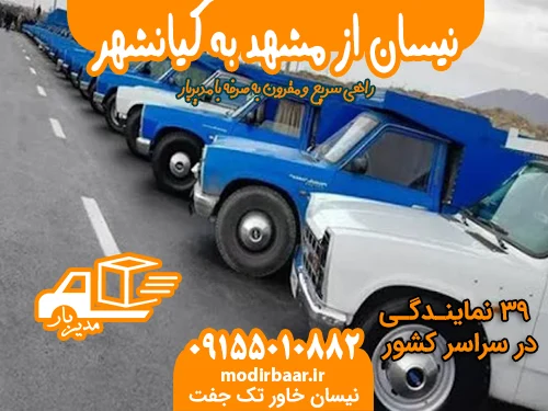 فاصله بین شهر مشهد تا کیانشهر تقریباً بین ۷۰۰ تا ۸۰۰ کیلومتر بسته به مسیر انتخابی است. این مسیر از جاده‌های اصلی کشور عبور کرده و نیازمند راننده‌ای باتجربه، ناوگانی مجهز و خودروهایی با ظرفیت مناسب است. نیسان بار به دلیل ظرفیت بارگیری متوسط، چالاکی و قیمت مقرون‌به‌صرفه، گزینه‌ای عالی برای حمل بار در این مسیر است.
